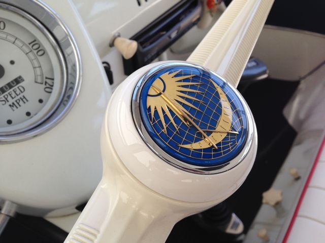 Steering wheel is fully restored and fitted with a rare sun and moon horn